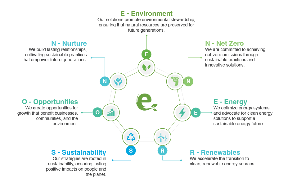 At Enerson, our name reflects our core mission: shaping a sustainable future. Each letter represents a principle that guides our work: